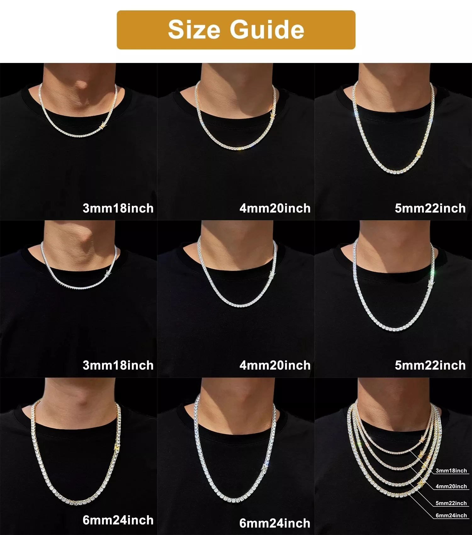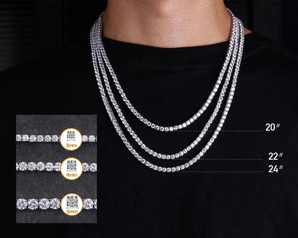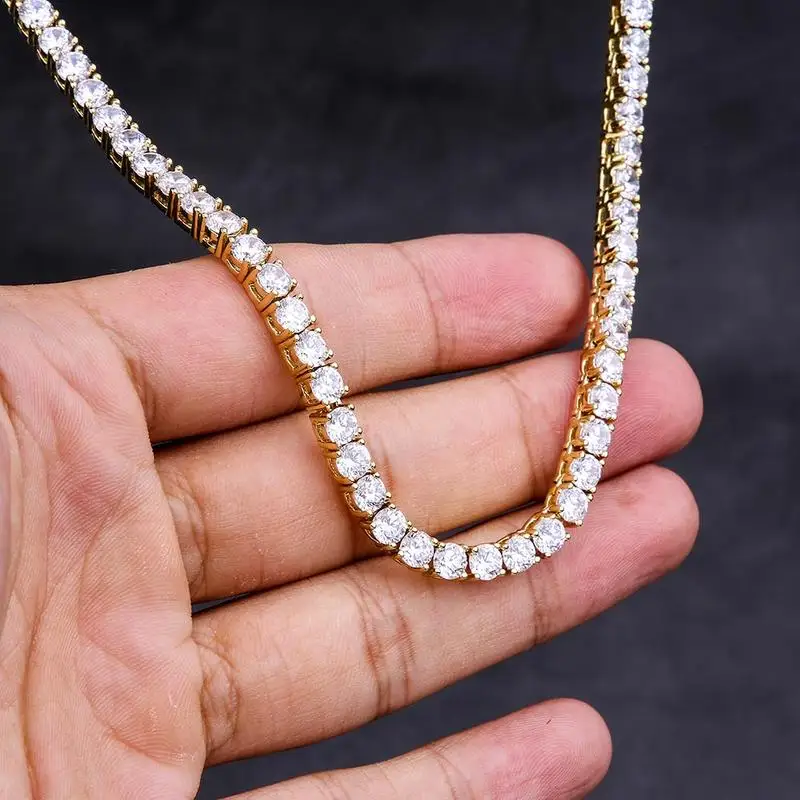 Specifications:Material: Copper+5A CZColor: Silver, GoldStone Type: 5A CZClasp Type: Double-Locking Custom Lock BoxLength (inch): 16-24inchWidth (mm): 3mm, 4mm, 5mm, 6mmFeatures:|Love And Hip Hop Diamond|Vvs Cuban Link|Does An Iced Chain Have Caffeine|**Unmatched Quality and Style**The Hip-Hop 1 Row CZ Tennis Chain Necklace is a testament to luxury and style. Designed for those who demand the best, this necklace features high-quality 5A Cubic Zirconia stones, hand-selected for their clarity and brilliance. The necklace is available in multiple widths, ranging from 3mm to 6mm, ensuring a perfect fit for any outfit or occasion. The double-locking custom lock box clasp provides added security, making it an ideal choice for those who value both fashion and function.**Durability and Longevity**Crafted with precision, this necklace boasts a robust construction that withstands the test of time. The copper base is plated with 0.3u gold, which is five times the standard plating, ensuring the necklace maintains its shine and color for at least a year without fading. The prong setting technique used for each stone guarantees that they will not fall out, offering a secure and bling-filled experience. The necklace is also free from lead, nickel, and cadmium, making it a safe and stylish accessory for all.**Versatile and Adaptable**Whether you're stepping out for a night on the town or looking to add a touch of hip-hop flair to your everyday ensemble, this necklace is versatile enough to fit any scenario. Its silver and gold color options cater to different personal styles, while the multiple widths allow for a customizable fit. The necklace's adaptability extends to its use in various settings, from casual outings to high-profile events. It's the perfect accessory for rappers, hip-hop enthusiasts, and anyone looking to make a bold fashion statement.